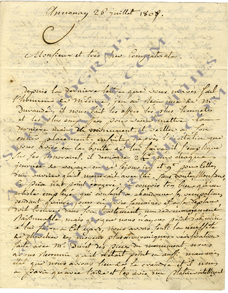 Lettre autographe signéeLettre autographe signée, adressée au sénateur Boissy d’Anglas. Annonay, 26 juillet 1807 ; 2 pages 1/2 in-4°, adresse avec marques postales.Très intéressante lettre sur le monument dédié aux frères Montgolfier. Il a cherché des...