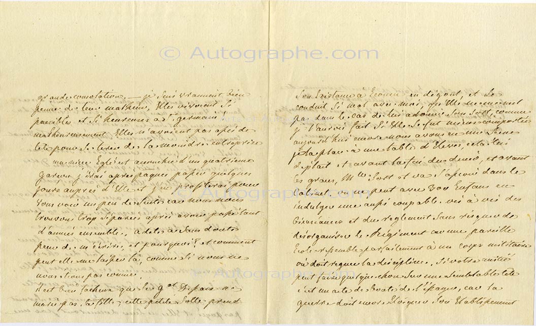 Lettre autographeLettre autographe, adressée à Nancy Macdonald, fille du maréchal Macdonald. 14 mars 1812 ; 3 pages 1/2 in-4°.« Je n’entends pas parler ma chère et bonne Nancy de ces pauvres Vaucher, mais je sais que c’est le tribunal de commerce...