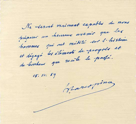 Pensée autographe signéePensée autographe signée. 15 avril 1959 ; 1 page in-4°. « Ne seront vraiment capables de nous préparer un heureux avenir que les hommes qui ont médité sur l’histoire et dégagé les éléments de progrès et de bonheur que recèle...