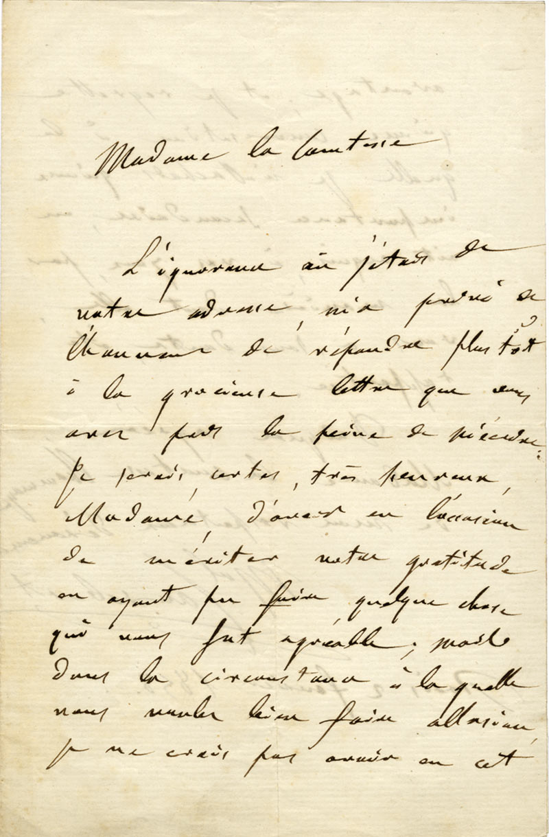 Lettre autographe signéeLettre autographe signée, adressée à une comtesse. Paris, 2 février 1858 ; 2 pages in-8°. Il n’a pu lui répondre plus tôt, ignorant son adresse : « Je serais, certes, très heureux, Madame, d’avoir eu l’occasion de...