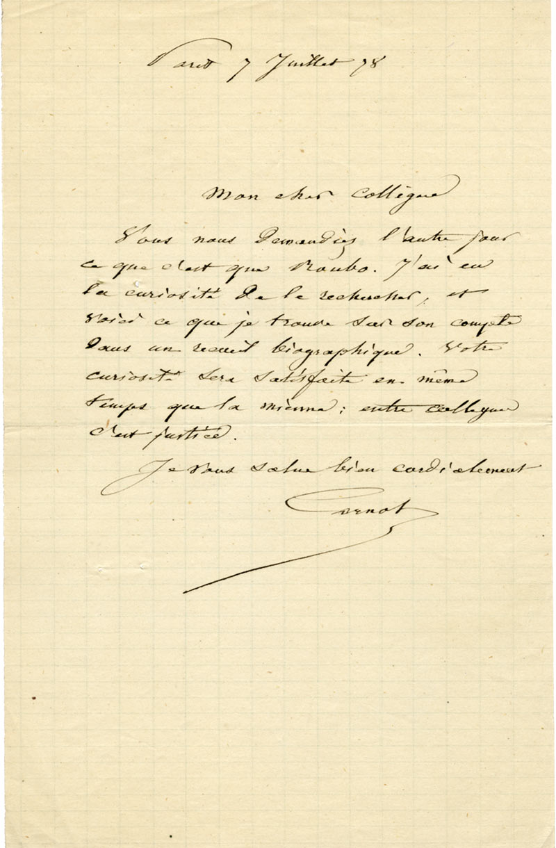 Lettre autographe signéeLettre autographe signée. Paris, 7 juillet 1878 ; 1 page in-12. « Vous me demandiez l’autre jour pour ce que c’est que Roubo. J’ai eu la curiosité de le rechercher et voici ce que je trouve sur son compte dans un recueil...