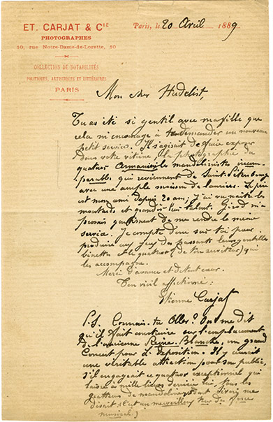 Lettre autographe signéeLettre autographe signée, adressée à M. Hudelist. Paris, 20 avril 1889 ; 1 page in-8°. En-tête imprimé en rouge « Et. Carjat & Cie Photographes ».« Tu as été si gentil avec ma fille que cela mencourage à te demander un...