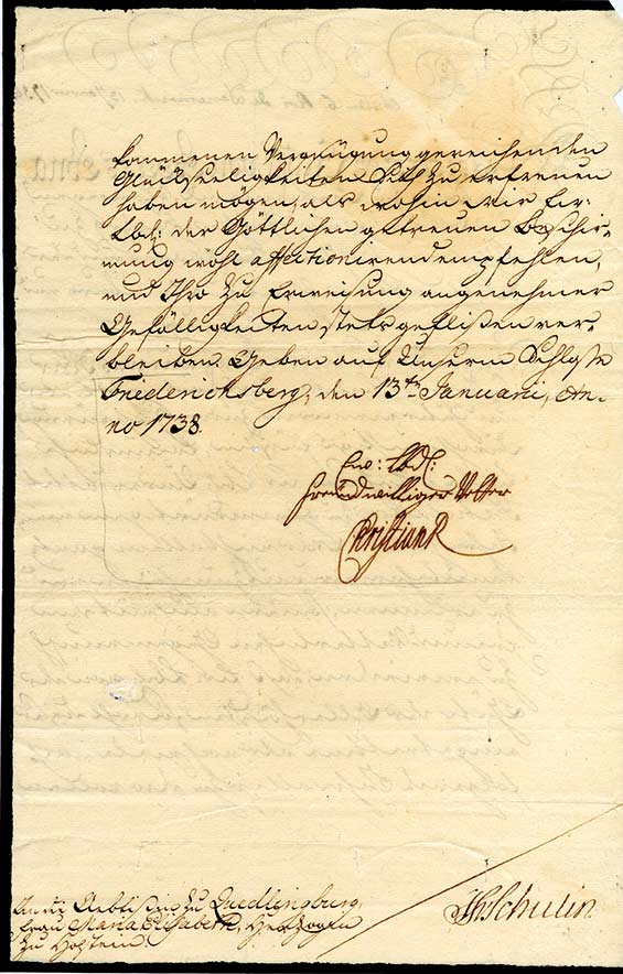 Lettre signéeLettre signée, avec compliment autographe, adressée à la duchesse Maria Elisabeth de Schleswig-Holstein, abbesse de Quedlinbourg. Friedericksberg, 13 janvier 1738 ; 2 pages in-folio. (deuil) ; en allemand. Vœux de nouvel an. On joint...