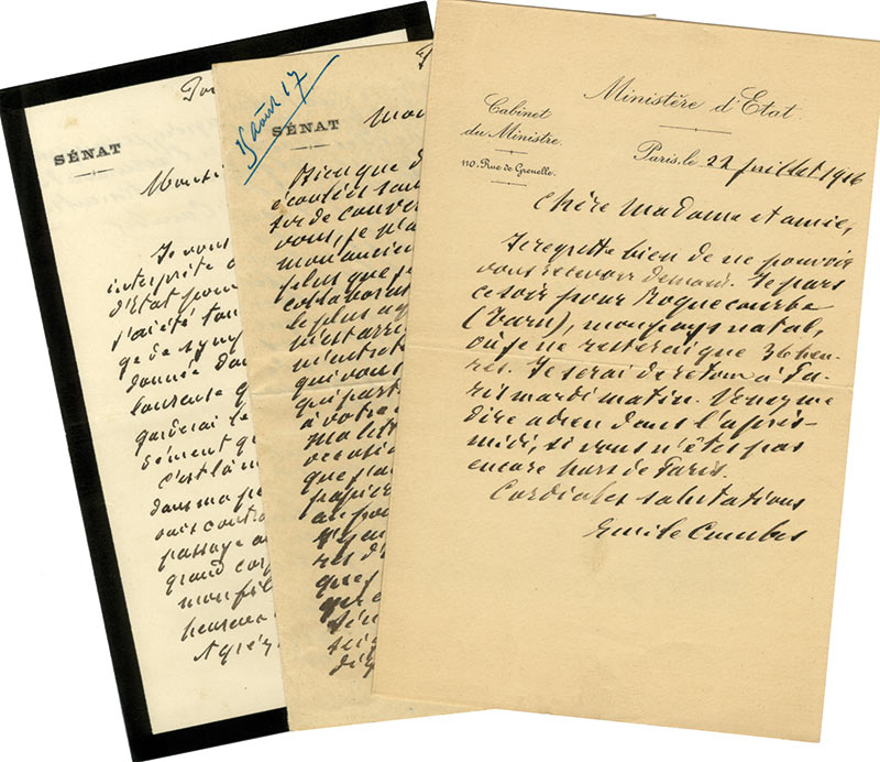 Ensemble de 3 lettres autographes signéesEnsemble de 3 lettres autographes signées. 1907-1917 ; 4 pages 1/2 in-8°.À la suite de la perte de son fils, il remercie son correspondant pour « les témoignages de sympathie qu’il m’a donné dans l’épreuve douloureuse que je...