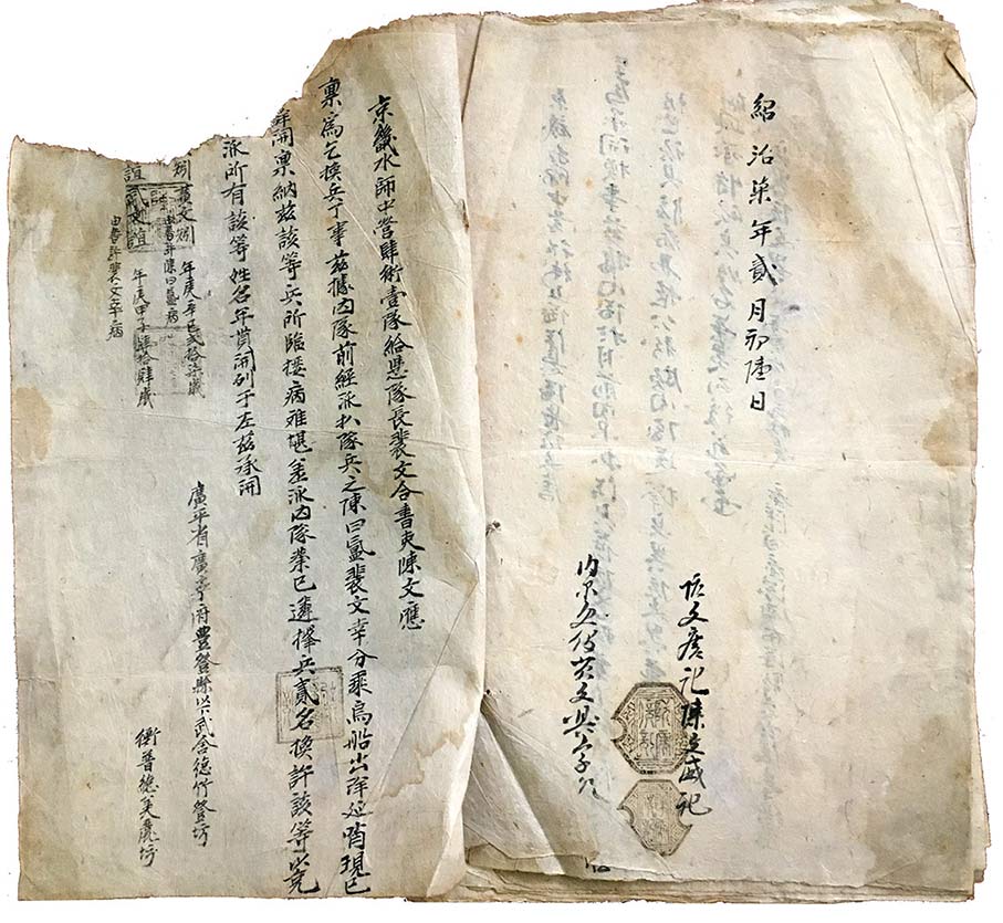 Pièce manuscrite, rédigée en chinois.Pièce manuscrite, rédigée en chinois. [Vers 1861] ; 32 pages sur papier très fin. (33 x 21 cm). Document relatant très certainement une bataille.