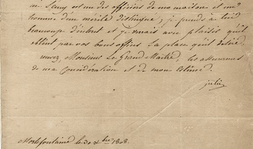 Lettre signéeLettre signée, adressée au Grand Maître de la Reine d'Espagne. Mortefontaine, 30 Xbre 1808 ; 1 page in-4°....