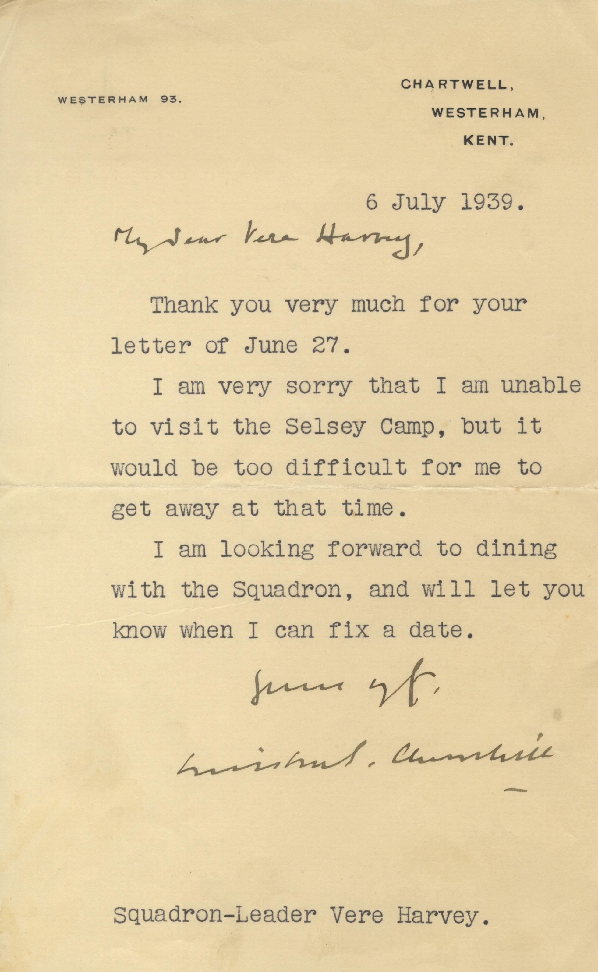 Lettre signéeLettre signée « Winston Churchill » adressée à Vere Harvey. 6 juillet 1939, 1 page in-8° sur papier à en-tête de son domicile à Chartwell ...