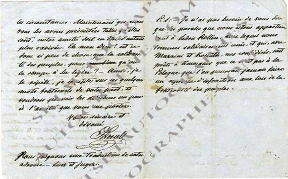 Lettre autographe signéeLettre autographe, signée « J. Dorcel », adressée à Charles Ribeyrolles. « Lundi » ; 3 pages in-16.Cette lettre a sans doute été écrite en exil [à Jersey ?]. « C’est en ancien ami, en vieux camarade que je viens vous demander...