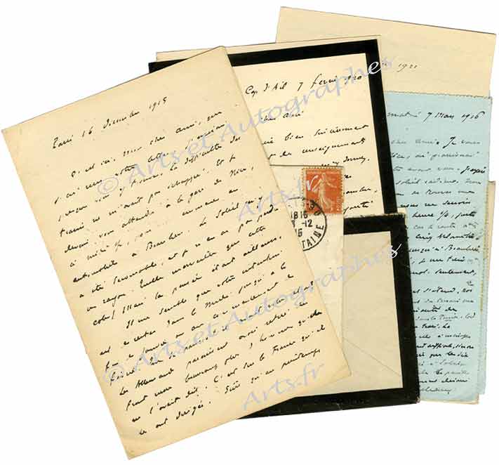 Ensemble de 8 lettres autographes signéesEnsemble de 8 lettres autographes signées, adressée au journaliste Henry Leyret [1864-1944]. Entre 1914 et 1921 ; ensemble de 18 pages in-12 ou in-8°, enveloppes timbrées jointes.Intéressante correspondance d’ordre politique que...