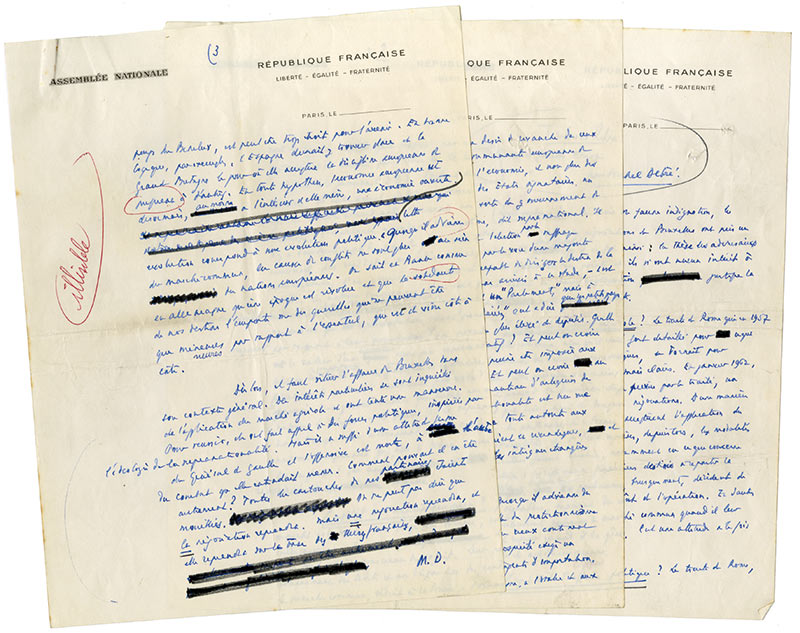 Ensemble de 3 manuscrits autographes dont 2 signés.Ensemble de 3 manuscrits autographes dont 2 signés. Sur papiers à en-tête de l’Assemblée nationale. Articles parus dans le journal Sud-Ouest.— « Crise de la fausse Europe ». 3 pages in-4° avec corrections autographes.—« Les...