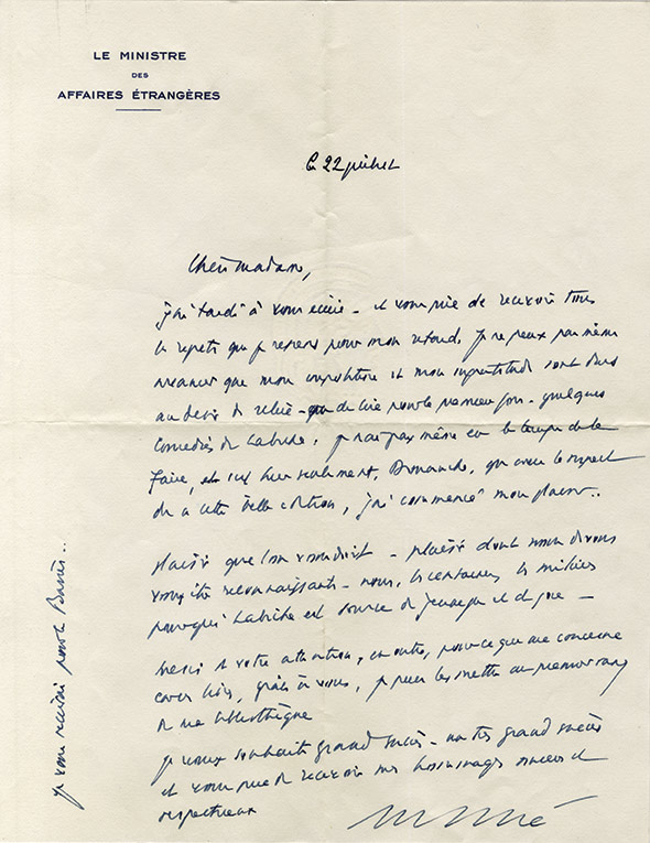 Lettre autographe signéeLettre autographe signée. « Lundi soir »; 1 page in-16 sur papier de deuil. « Je me rendrai très volontiers à l’invitation que vous m’avez fait l’honneur de m’adresser pour mercredi matin. »