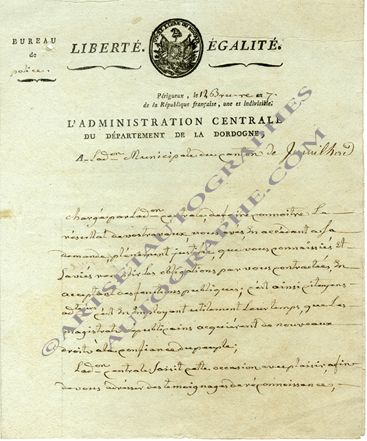 Pièce manusucrite signéePièce manuscrite signée. Périgueux, 12 brumaire an VII [2 novembre 1798] ; 1 page 1/2 in-4°. En-tête imprimé « Administration Centrale de la Dordogne » avec petite vignette. Sur le fonctionnement de l’administration : « C’est...