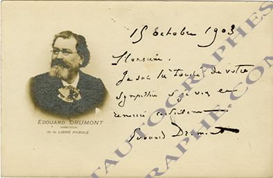 Carte autographe signéeCarte autographe signée. 15 octobre 1903 ; 1 page in-12 oblongue sur carte photographique avec son portrait. « Je suis très touché de votre sympathie et je vous en remercie cordialement. »
