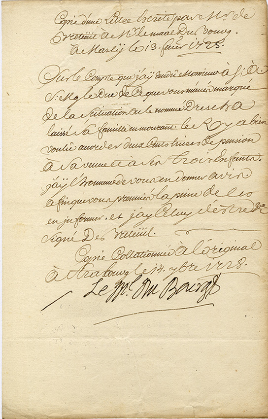 Pièce signéePièce signée. Strasbourg, 14 septembre 1728 ; 1 page in-folio. « Copie dune lettre escrite par M r de Breteuil à M r le M al Du Bourg, à Marly le 13 fevrier 1725 ». Sur une pension octroyée par le roi.
