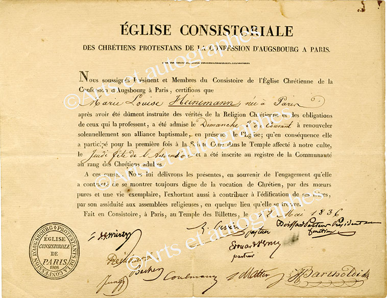 Certificat de baptême impriméCertificat de baptême imprimé à en-tête de l’Église consistoriale des chrétiens protestants de la confession d’Augsbourg à Paris. 12 mai 1836 ; 1 page in-4° oblongue. En faveur de Marie-Louise Heinemann, née à Paris qui « a...