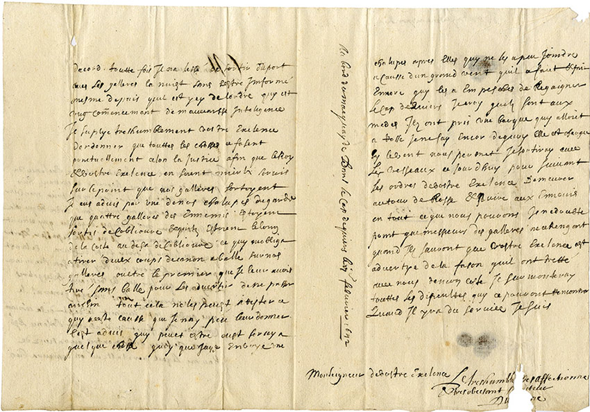 Lettre autographe signéeLettre autographe signée, adressée au maréchal de Brézé, général des armées de Sa Majesté en Roussillon et Vice-Roi de Catalogne. Au bord du Macquayde dans le cap de Quiers 17 février 1642 ; 3 pages in-4°, adresse avec cachets...