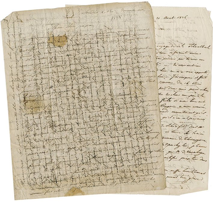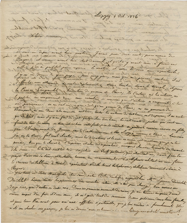 Lettre autographe signéeLettre autographe signée, adressée à sa mère, épouse de Louis d'Eichthal, fondateur de la banque Louis d'Eichthal à Paris. Leipzig, 4 octobre 1836 ; 3 pages in-4°, adresse avec marques postales. ...