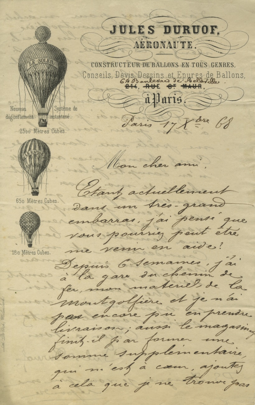 Lettre autographe signéeLettre autographe signée à un ami. Paris, 17 octobre 1868 ; papier à en-tête “Aéronaute, Contructeur de ballons en tous genres. Illustrations de différentes mongolfières. 1 page in-8°. Lettre où Duruof demande une aide...