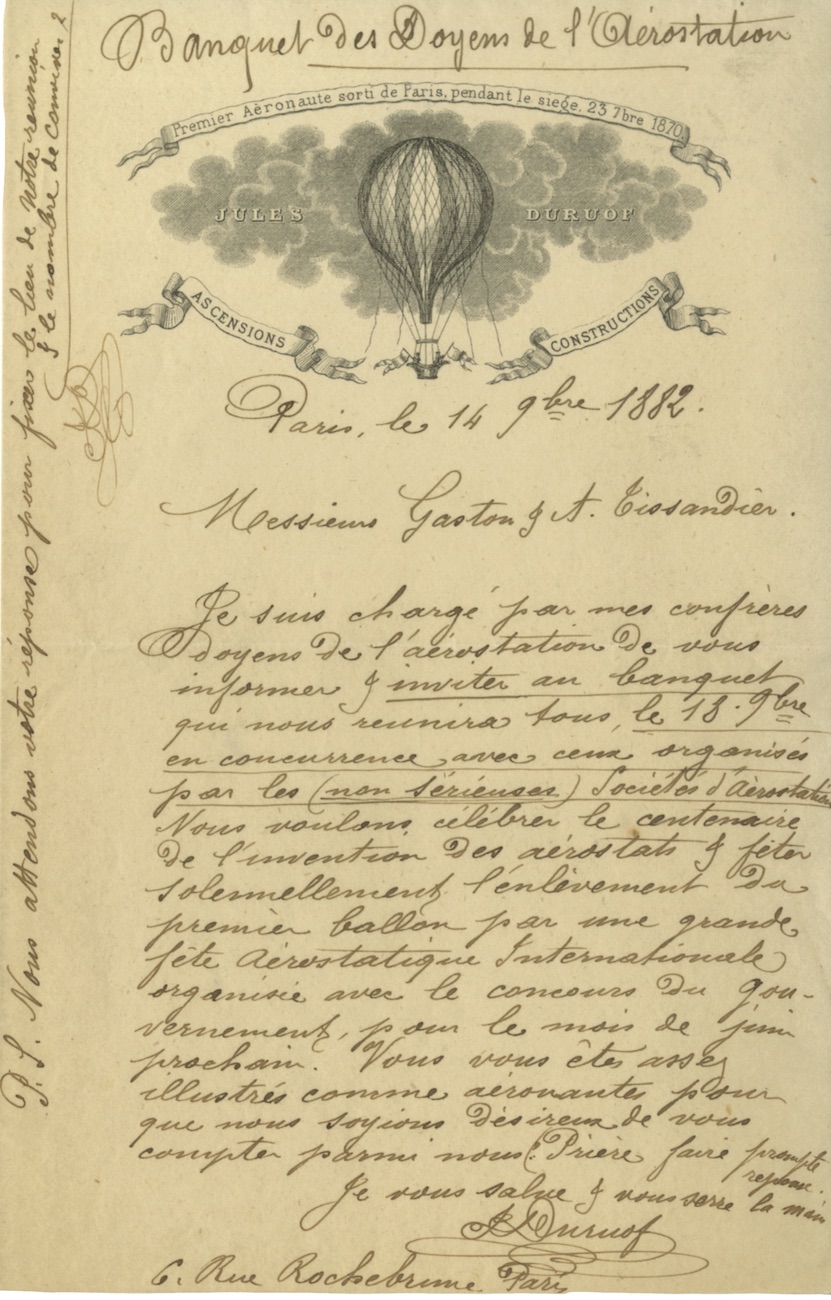 Lettre autographe signéeLettre autographe signée à Gaston g et Tissandier . Paris, 14 septembre 1882 ; 1 page in-8°. Papier à son en- tête représentant une mongolfière s’élevant dans le ciel. Invitation au banquet de L’aérostation. « Je suis chargé...