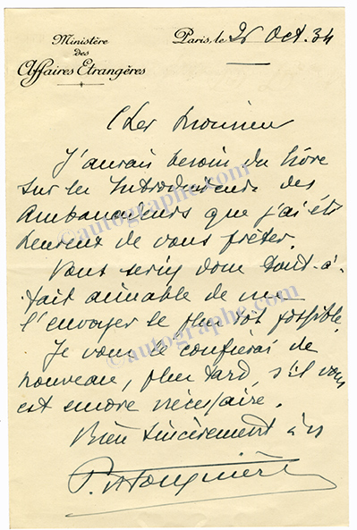 Lettre autographe signéeLettre autographe signée , adressée au journaliste René Brest. Paris, 26 octobre 1934 ; 1 page in-8°. « J’aurai besoin du livre sur les introducteurs des ambassadeurs que j’ai été heureux de vous prêter. Vous seriez donc tout à...