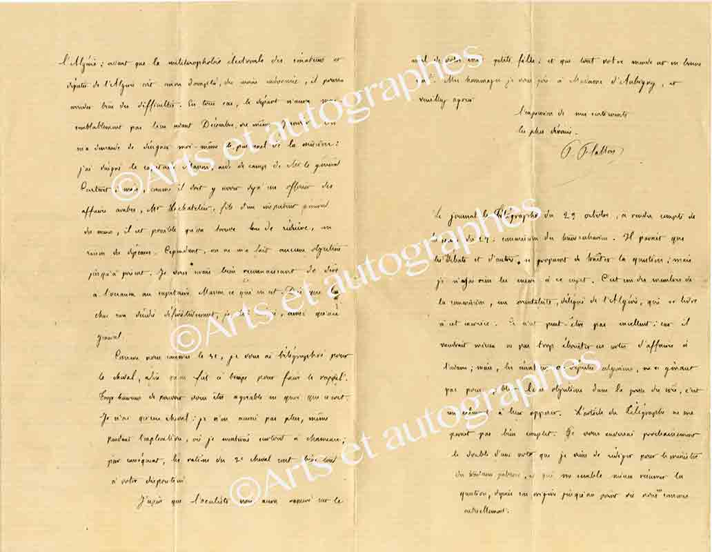 Lettre autographe signéeLettre autographe signée, adressée à M. d’Aubigny. Paris 31 octobre 1879 ; 3 pages in-8°. Sur la préparation de son ultime et tragique mission d'exploration au Sahara, pour laquelle il partira le 7 janvier suivant : « La chose a...