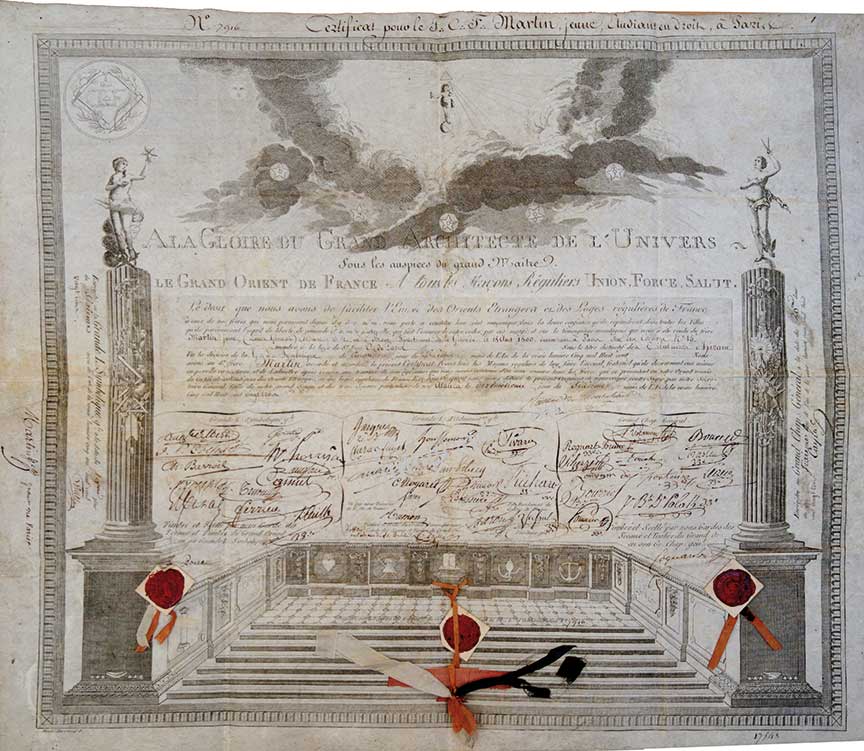 Certificat maçonniqueCertificat maçonnique en faveur du frère Martin jeune (Louis Germain), étudiant en droit, natif de Blaye, département de la Gironde, demeurant à Paris, rue des cordiers, membre de la loge de Saint-Jean de Paris « sous le signe des...