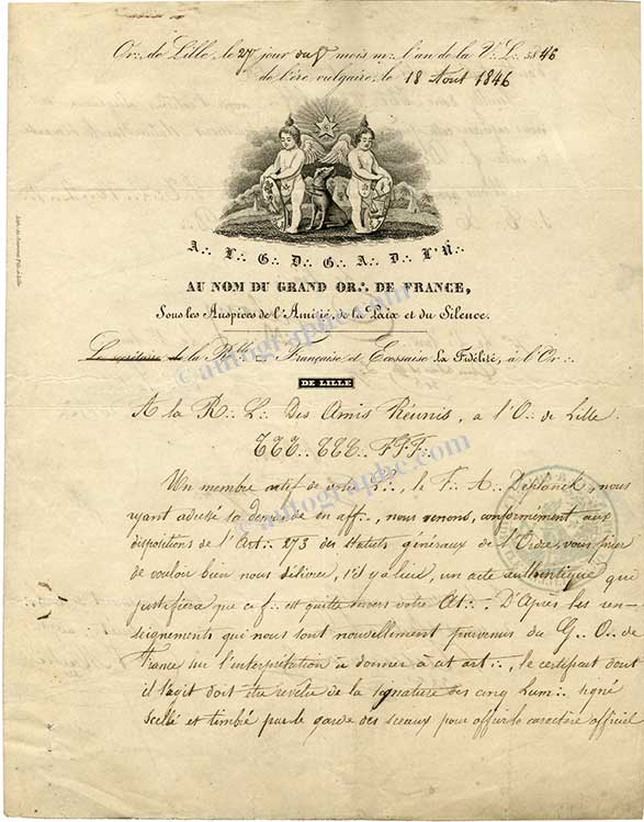 Lettre signéeLettre signée des membres de l’Orient de Lille, adressée à M. Vandalle, négociant à Lille. « Or :. de Lille, le 27e jour du Ve mois m:. l’an de la V:.L:. 5846 de l’ère vulgaire, le 18 août 1846 » ; 2 pages in-4°, adresse sur...
