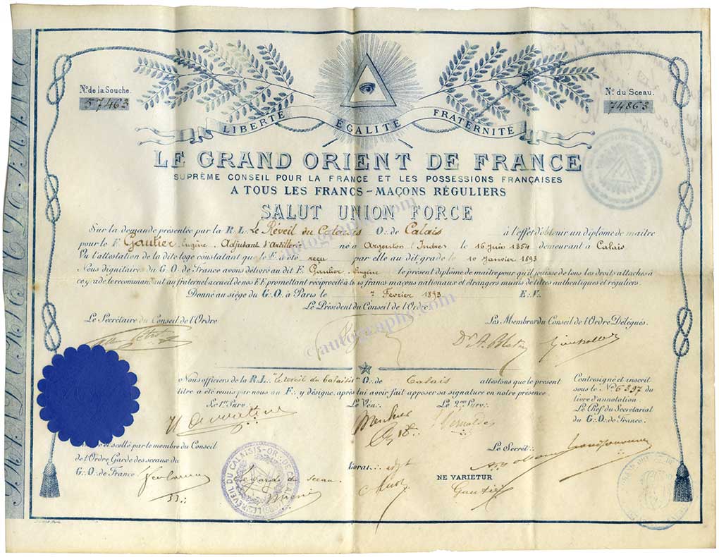 Brevet franc-maçonniqueBrevet franc-maçonnique. Paris, 7 février 1893 ; 350 x 270 mm, petite déchirure aux fentes au milieu. Très bel en-tête illustré maçonnique « Le Grand Orient de France », imprimé en bleu. Beau sceau à sec sur papier couleur...