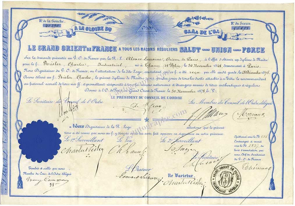Très beau diplômeTrès beau diplôme très décoratif en bleu sur vélin du Grand Orient de France. Paris, 30 novembre 1878 ; 1 page in-folio oblongue. Très bel en-tête illustré maçonnique « Le Grand Orient de France », imprimé en bleu. Beau sceau...