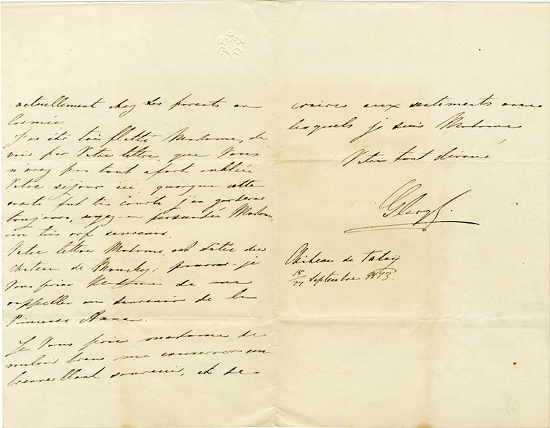Lettre autographe signéeLettre autographe signée, adressée à une dame. Château de Tatoy (Tatoi près d’Athènes) 27 septembre 1873 ; 2 pages 1/2 in-8° sur papier avec motif floral à sec ; en français.« Permettez-moi de venir aujourd’hui vous remercier...