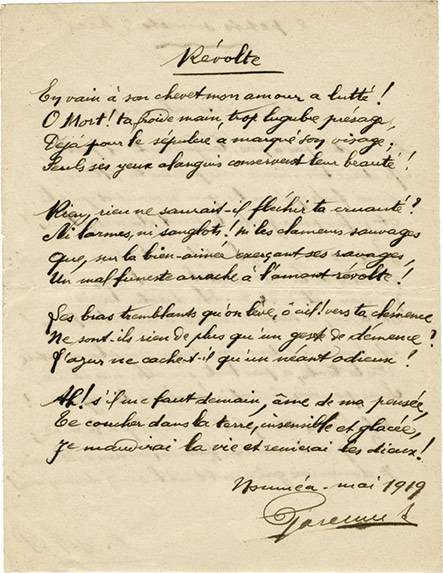 Manuscrit autographe signéManuscrit autographe signé de 2 sonnets. Nouméa, mai 1919 ; 2 pages in-4°. « 2 petits sonnets d'hier » : « Premières Alarmes » (« Le jardin, pas à pas, languissante et pâtie »), et « Révolte » (« En vain à son chevet...