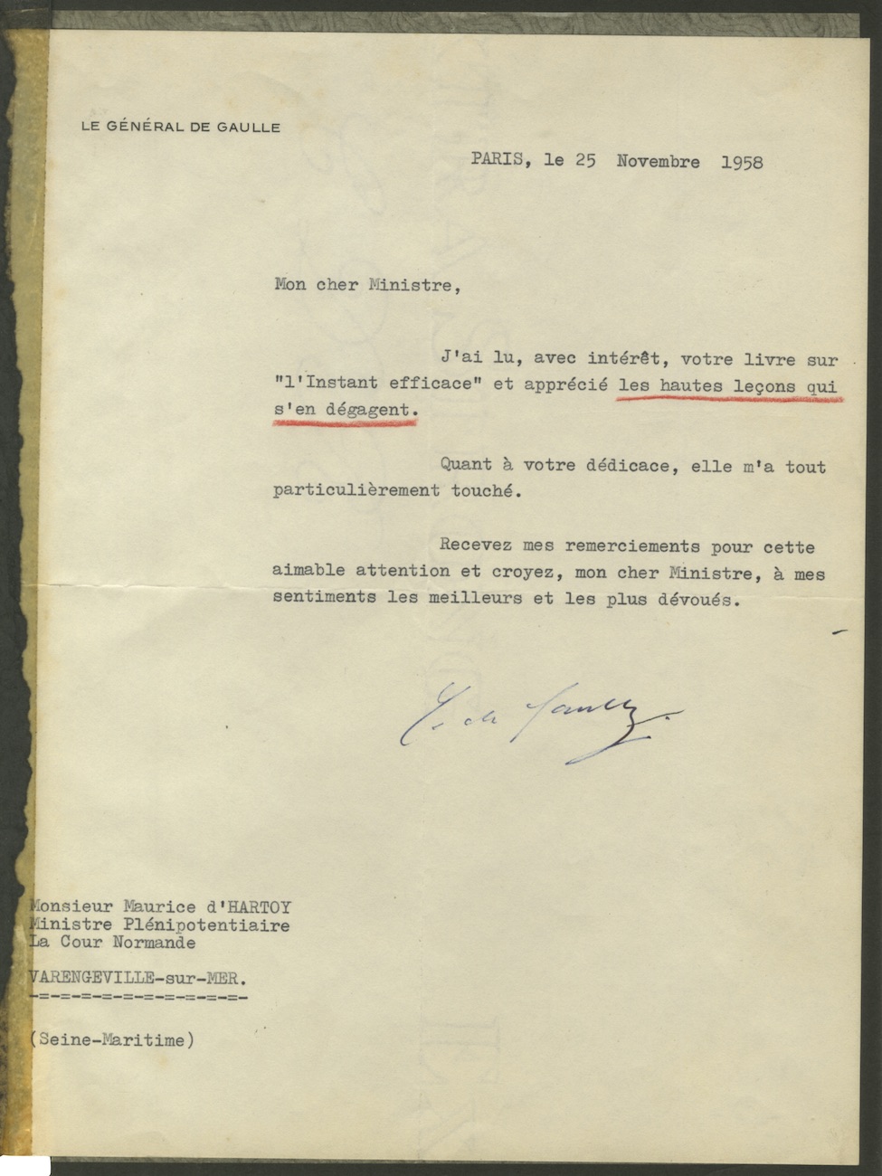 Lettre dactilographiée signéeLettre dactilographiée signée, adressée à Mr Maurice D’Hartoy. Paris, 25 novembre 1958; 1 page in-folio. Bordure gauche contre collée sur carton leger . En-tête “ Le GÉNÉRAL De GAULLE ”. ...