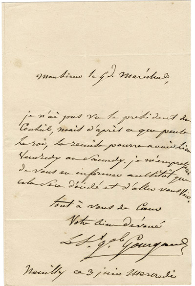 Lettre autographe signéeLettre autographe signée, adressée au général Bertrand. « Neuilly ce 3 juin 1840 mercredi » ; 1 page in-8°. ...