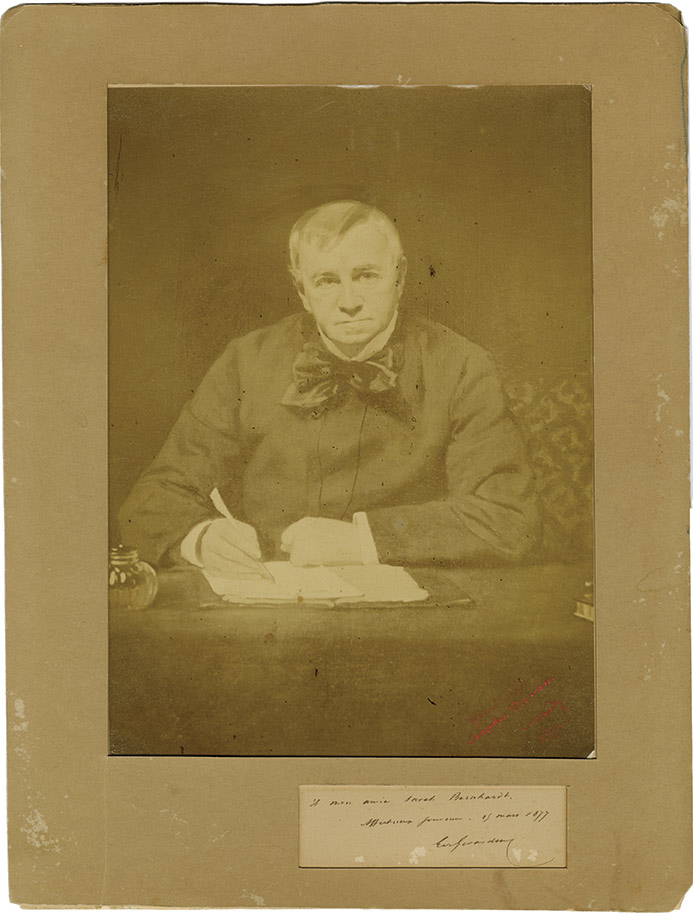 Photographie collée sur un carton, avec envoi autographe signéPhotographie collée sur un carton, dédicacée à Sarah Bernhardt. 15 mars 1877 ; 24 X 17 cm. « À mon amie Sarah Bernhardt. Affectueux souvenir. 15 mars 1877. E. de Girardin. » La photographie elle-même est signée par Nadar : «...
