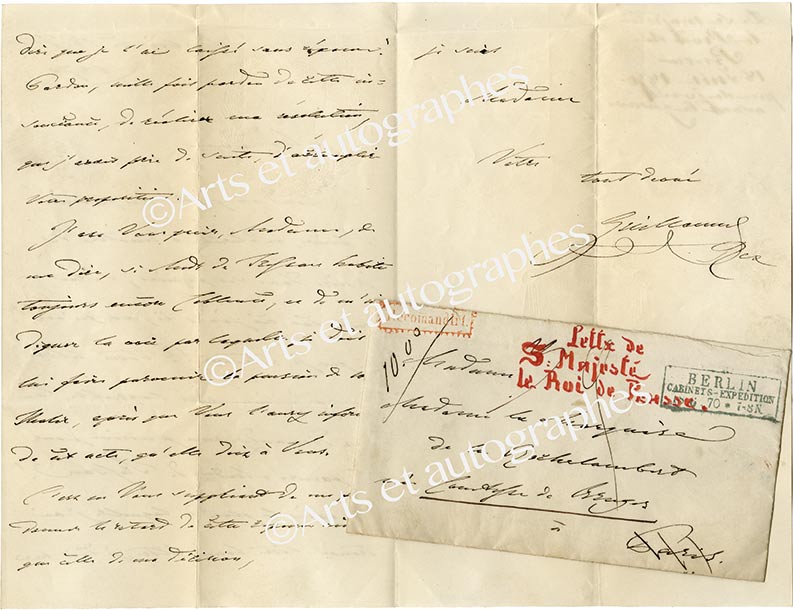 Lettre autographe signéeLettre autographe signée « Guillaume Rex », adressée à Mme la marquise de La Rochelambert, née comtesse de Bruges. Berlin, 18 juin 1870 ; 2 pages ½ in-8°, tranches dorées, filigrane aux armes de Prusse et portrait aux lauriers ;...
