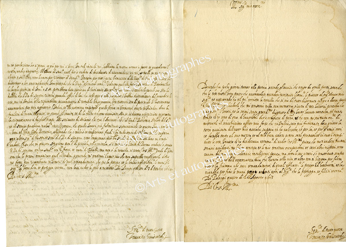 Ensemble de lettres autographes signéesEnsemble de 2 lettres autographes signées [adressées à M. Duplessis, ancien conseiller du roi Henri IV]. Paris, 2 août 1613 et 3 octobre 1614 ; ensemble de 3 pages in-folio, en italien. Correspondance intéressante à traduire.