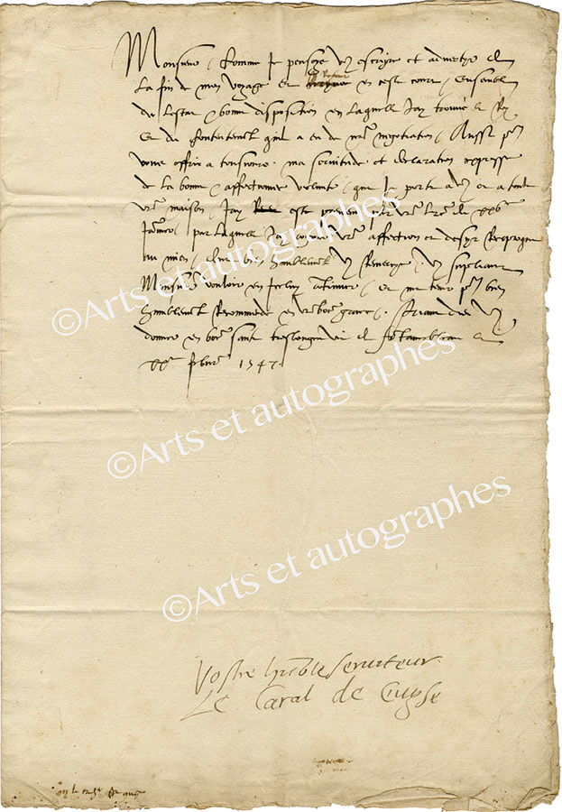 Lettre signéeLettre signée, avec compliment autographe « Vostre humble serviteur Le Caral de Guyse », adressée au cardinal Saint-Ange. Fontainebleau, 20 février 1547 (pour 1548) ; 1 page in-folio, avec adresse au verso avec reste de sceau de cire...