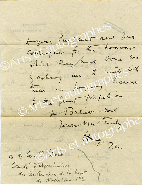Lettre autographe signéeLettre autographe signée, adressée à M. Weil. St Peter’s-in-Thanet, le 25 juillet 1920 ; 2 pages in-8° en anglais, enveloppe jointe. Il donne son accord pour utiliser son nom dans le cadre du patronage du comité d’organisation du...