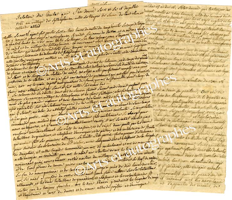 Lettre manuscrite d’un soldat ou officierLettre manuscrite d’un soldat. 23 juillet [1761] ; 6 pages et demie in-4°, adresse, cachet cire rouge, marque postale « Arm. du B. Rhin » (petit manque par bris de cachet avec perte de quelques lettres).Relation du combat près de...