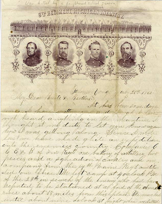 UNION SOLDIER’S LETTER ON PATRIOTIC LETTERHEADLettre autographe signée d’un soldat de l’Union. Bâton-Rouge, Louisiane, 26 juillet 1862 ; 4 pages in-4°, en anglais, fentes. En-tête patriotique illustré. Le soldat qui signe ici « George » écrit à sa famille sur une jolie...