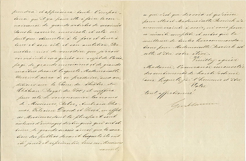 Lettre signéeLettre signée, adressée à une musicienne. La Haye, 25 décembre 1874 ; 3 pages in-4°. Il lui est reconnaissant de prendre soin de sa « Pensionnaire de 1ère classe », Mlle Van Erps Reerink et de lavoir invitée à la soirée...