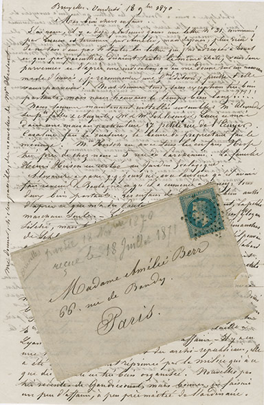 Enveloppe avec correspondance familiale datée de Bruxelles le vendredi 18 novembre 1870.Enveloppe avec correspondance familiale datée de Bruxelles le vendredi 18 novembre 1870....