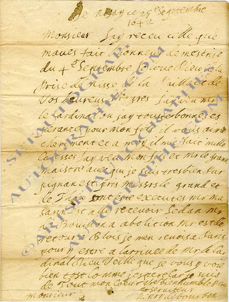Lettre autographe signéeLettre autographe signée, adressée au duc de Longueville. De Nozay, le 25 septembre 1642 ; 1 page in-4°. À cette époque, le père du Grand Condé est enfin bien en cour. Sa vie a été très mouvementée. C’est lui qui, pour...