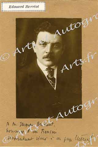 Photographie avec dédicace autographe signéePhotographie avec dédicace autographe signée sur le montage, adressée à M. Bréhant. 75 x 115 mm sur un carton 125 x 180 mm. Photographie collée sur un carton sur lequel E. Herriot a écrit « À M. Jacques Bréhant, hommage d’un...