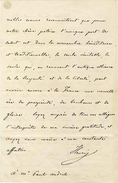 Lettre autographe signéeLettre autographe signée « Henri », adressée à M. Paul Andral (1828-1889). Venise, 14 avril 1860 ; 2 pages in-8, enveloppe jointe.« Vous savez déjà, Monsieur, combien je suis heureux de voir mes jeunes amis se livrer à l’étude...