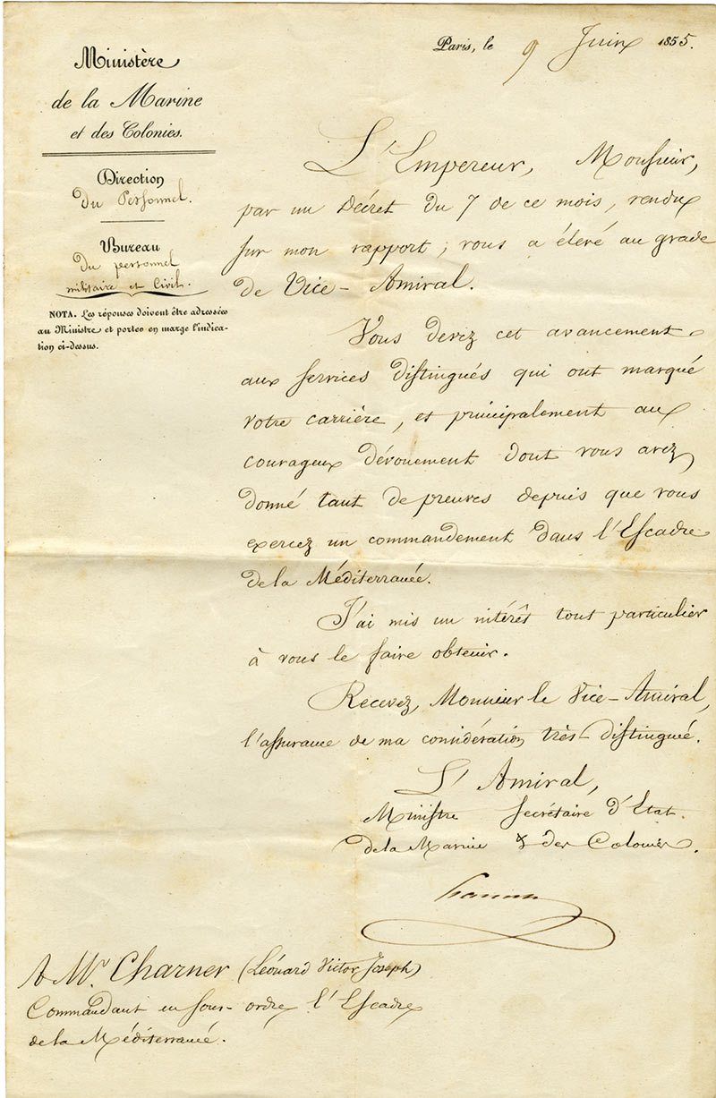 Pièce signée, adressée à Léonard Victor Josph CharnerPièce signée, adressée à Léonard Victor Joseph Charner. Paris, 9 juin 1855 ; 1 page grand in-4°Nomination au grade de vice-amiral. « L’Empereur, Monsieur, par un décret du 7 de ce mois, rendu sur mon rapport, vous a élevé au...