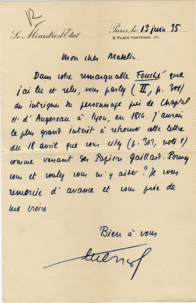 Lettre autographe signéeLettre autographe signée, adressée à Louis Madelin. Paris, le 13 juin 1935 ; 1 page in-8°. « Dans votre remarquable Fouché que jai lu et relu, vous parlez (II, p. 301) des intrigues du personnage puis de Chaptal et dAugereau à...