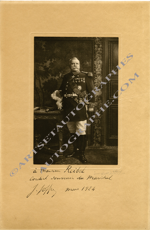 Photographie signéePhotographie avec dédicace autographe signée. 1924 ; 26 x 17 cm.Très belle photographie du maréchal en grand uniforme, dédicacée : « à Monsieur Reibel cordial souvenir du Maréchal J. Joffre mars 1924 ».