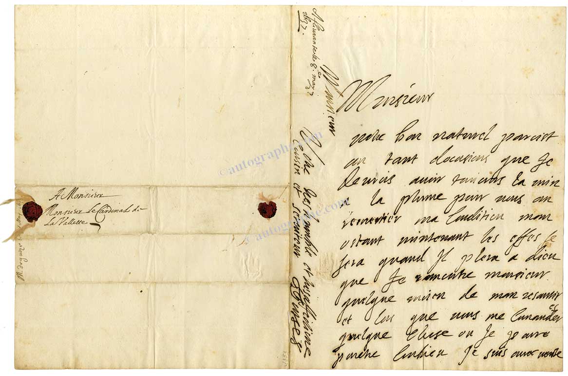 Lettre autographe signéeLettre autographe signée, adressée au cardinal de La Vallette. Fleurance, le 8 mai 1637 ; 1 page in-4°, avec adresse avec cachets de cire rouge à ses armes sur lacs de soie rose. « Vostre bon naturel paroit an tant docasions que je...