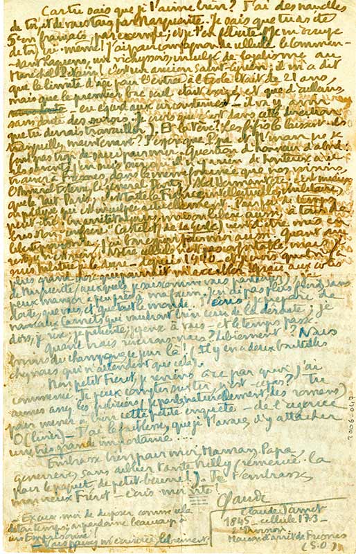 Lettre autographe signéeLettre autographe signée. « Fresnes, 2 décembre 1944 (Saint-Austerlitz !) » ; 2 pages in-8°. Rare lettre durant sa période de détention. Claude Jamet fut un collaborateur que le pacifisme mena à l’hitlérisme. Il fut libéré de...